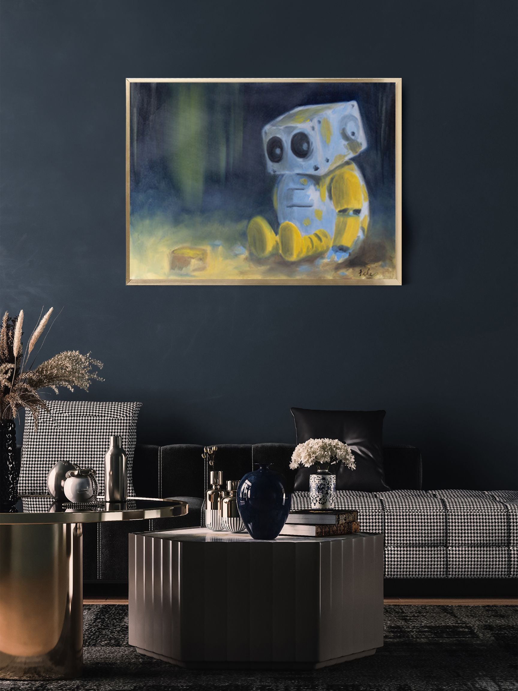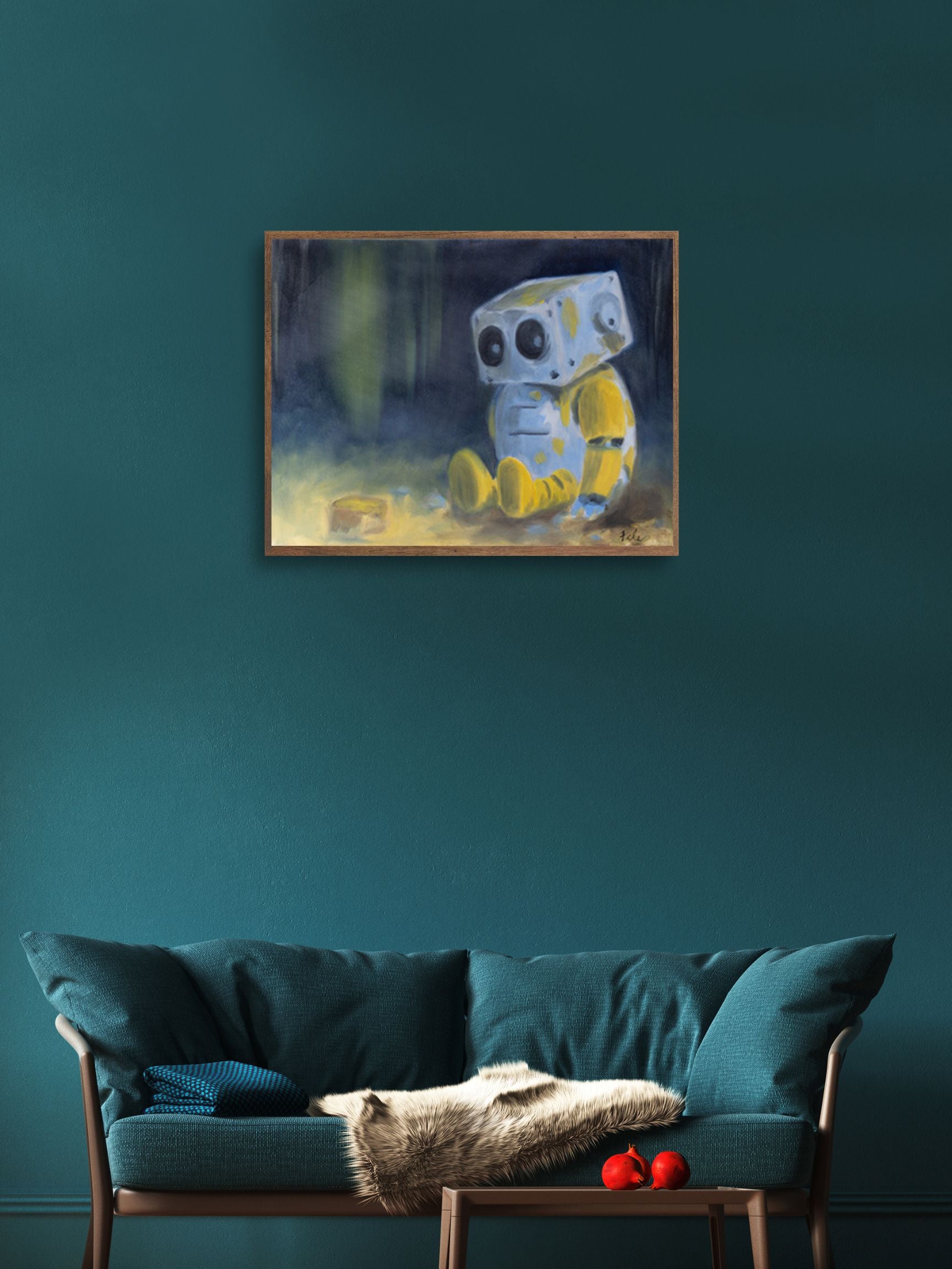 Crafted with meticulous attention to detail, the print captures the dual essence of companionship and loss, evoking a sense of warmth and melancholy. The robot, while inanimate, is imbued with a soulful depth that mirrors the artist's fond remembrances of her lost toy. The image serves not just as a visual representation but as a portal to the past, where joy and sorrow intertwine.